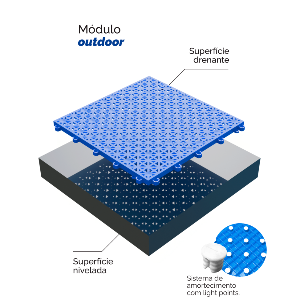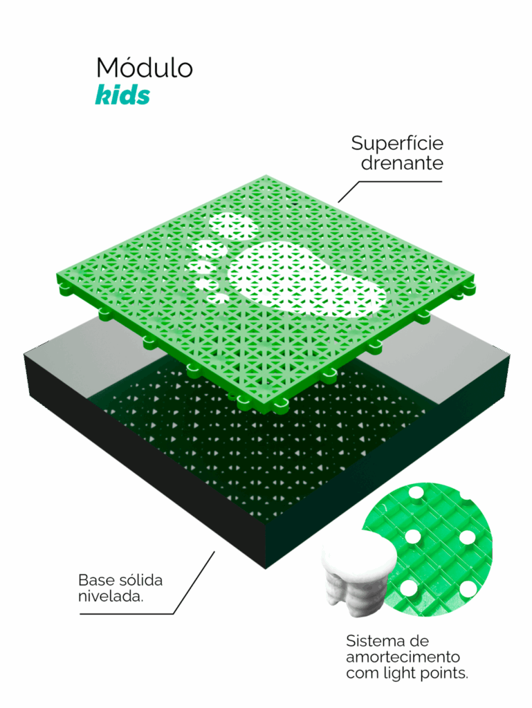 Escoamento rápido de água da chuva, atrito ideal para esportes e proteção UV.